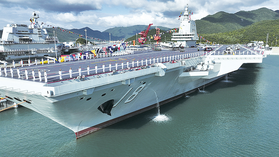 11月5日,我国第一艘电磁弹射型航空母舰福建舰入列授旗仪式在海南三亚某军港举行。 新华社记者 李 刚摄